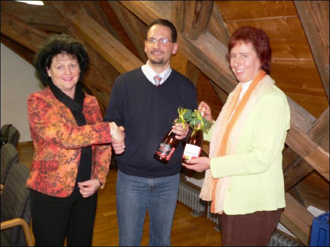 Den Dank des Arbeitskreises an den scheidenden Sozialamtsleiter Werner Mahr für die geleistete Aufbauarbeit brachten die beiden Kreisrätinnen Rita Stäblein (rechts) und Monika Weinbeer auch mit zwei flüssigen Präsenten zum Ausdruck.