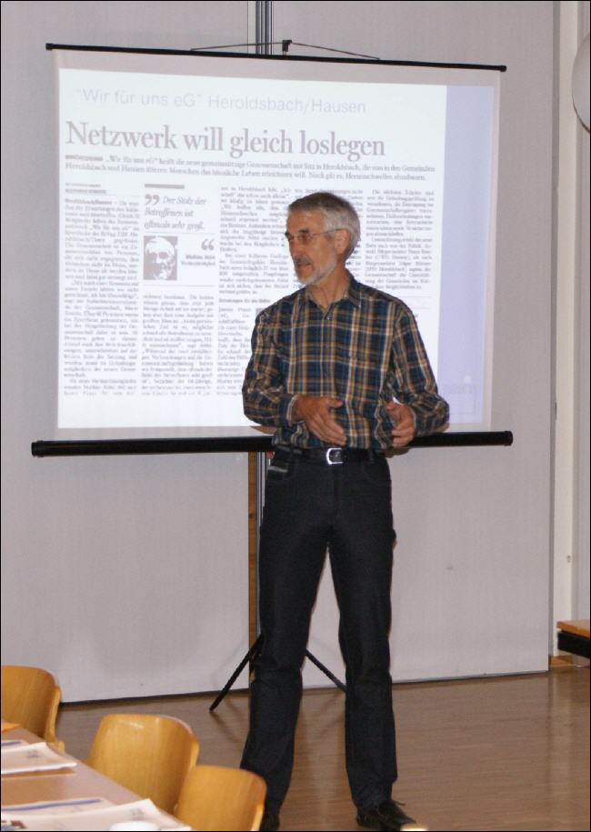 Am Freitag, den 04.11.2011, besuchte eine Exkursionsdelegation mit mehr als 20 Teilnehmern aus dem Landkreis Haßberge Forchheim, um sich vor Ort im Bürgerzentrum durch Vorträge über das Seniorennetzwerk „Wir für uns eG“ aus Heroldsbach und Hausen, den Mittagstisch der Christuskirche Forchheim und die Telefonkette des Projekts “Lieber daheim” der AWO-Forchheim zu informieren. |